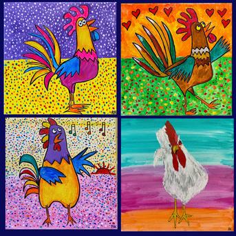 "Roosters" - series of acrylic on 10"x10" canvases. COMMISSIONED