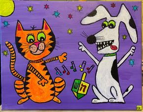 "Carrot and Shayna Play Dreidel" acrylic on 11"x14" canvas GIFTED